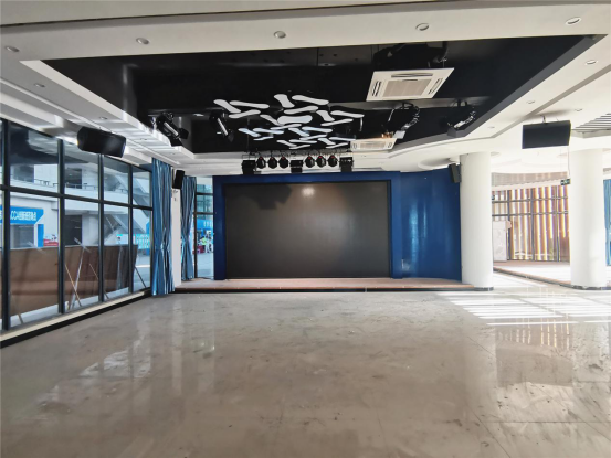 学校一楼报告厅高雅而明亮,主扩音箱采用AT-12,水平吊挂安装。它那近似圆弧流线形的箱体设计,没有棱角、感官更柔和,发出的音质圆润细腻,人声与音乐兼顾得当,充分满足厅内扩声所需。