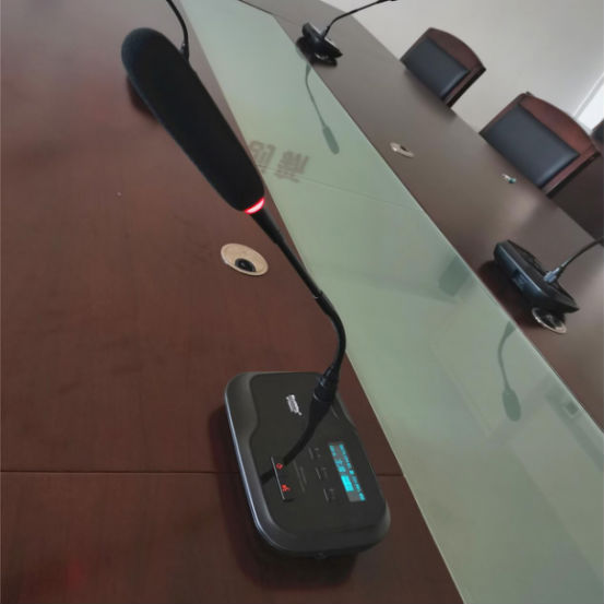 长方形会议桌上摆放着一套Motivity的无线会议系统,由系统主机MT600WZ、主席单元MT680WC、客席单元MT680WD组成。其具备讨论发言、视像跟踪等功能,无线连接的安装方式,方便、整洁又美观,加上自带的液晶显示屏,可实时提示人员进行操作。