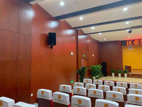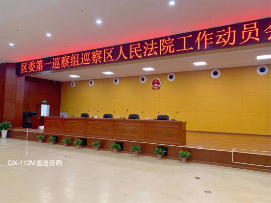 根据审判庭整体设计,以“QX-215主扩音箱+QX-118超低音箱”分别落地叠放于舞台两侧,并利用处理器对它们进行延时耦合,低音声能叠加3dB,营造起良好的声场。