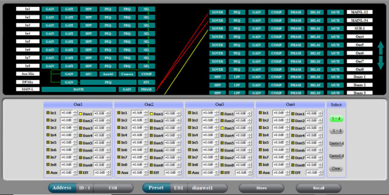 由于脸谱广场扩声面积较大,为实现良好的声像定位效果,采用了分布式集中式扩声法,对③④点的线阵列系统在处理器进行了延时处理,以保证观众听到的声能还是从①②点的主扩声能过来的,从而实现灯光秀的音视觉同步。