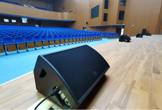 在舞台返听方面,采用6只QX112M舞台返送音箱,其中4只为流动返送,2只为固定返送。考虑舞台纵深较深,所以放置在舞台前区,来满足舞台区表演者的听音需求。