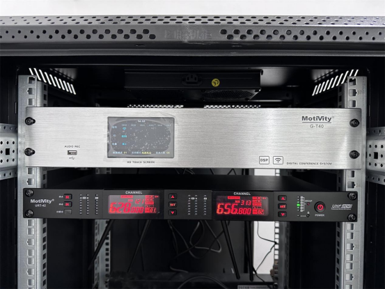 在发言系统方面,配置的是一套强大的数字会议系统,由无线、有线共用的双模数字会议主机G-T40、无线主席单元G-T40C和12台无线客席单元G-T40D组成,支持无线和有线两种连接方式,能够满足不同类型的发言需求。此外,还准备了一套URT-42无线手持话筒,方便会上人员随时进行流动演讲。