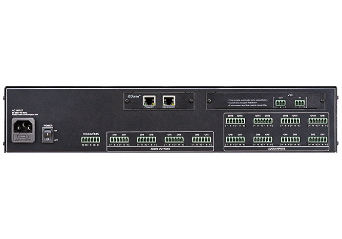 产品功能:32位DSP芯片处理,96kHz采样率,24bit AD/DA转换。26 x 1 6的核心矩阵,其中包含1 6个本地平衡Line/MIC输入通道、8个本地输出通道、可通过选配DT88型网络音频插卡扩展8个D a n t e输入通道和8个D a n t e输出通道、一个A U X内部混音通道、一个双效果器内部编组通道。本地每输入通道可选择独立话放带+48V幻像供电,话放增益可单独调节。支持AES67技术标准,可跨协议、跨网段音频互通;内置AEC实现远程电视电话会议中回声消除的能力,具备自动混音、自动增益控制、自动反馈抑制、噪声抑制等功能;输入通道处理部分包含低切,独立反馈抑制(5级),5段参量均衡,噪声门,增益,静音,相位,连动调节,音量编组调节等处理功能。输入部分拾音灵敏度可自适应调节,达