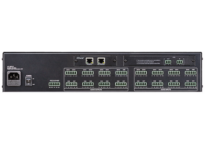 产品功能:32位DSP芯片处理,96kHz采样率,24bit AD/DA转换。32x32通道的全混音矩阵设计,其中包含16个本地模拟平衡Line/MIC输入通道、16个本地模拟输出通道。本地每输入通道可选择独立话放带+48V幻像供电,话放增益可单独调节。可通过选配DT3232网络音频插卡,扩展32路Dante输入、32路Dante输出;(选配网络音频矩阵卡后,前16*16为本地/网络信号二选一,后16*16通道为纯网络通道)支持AES67技术标准,可跨协议、跨网段音频互通;内置AEC实现远程电视电话会议中回声消除的能力,具备自动混音、自动增益控制、自动反馈抑制、噪声抑制等功能;输入通道处理部分包含低切,独立反馈抑制(5级),5段参量均衡,噪声门,增益,静音,相位,连动调节,音量编组调节等处理功能。输