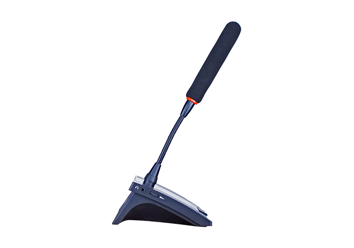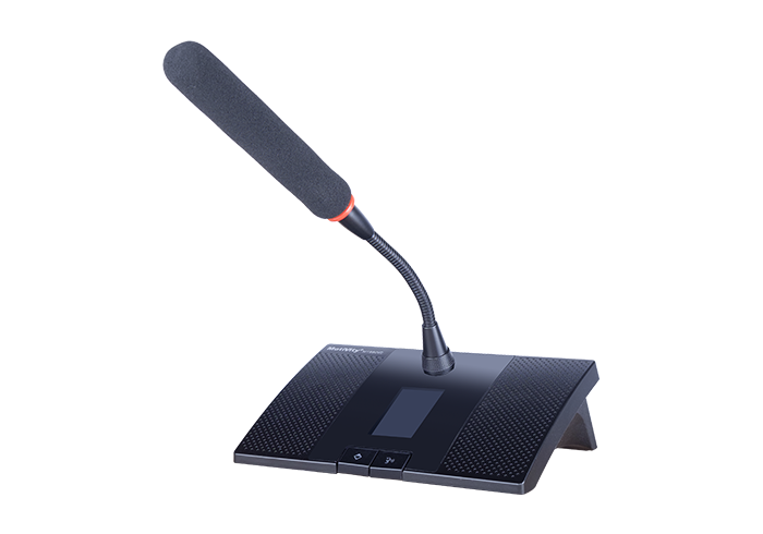 Digital intelligence智能数字化设计控制电路。单元为无源设备,由系统主机供电。输入电压为24V,属安全范围高保真单指向性电容咪芯,声音还原、清晰度高、噪音小;拾音头物理长度达到12cm;配置2.4寸高清彩色显示屏,具备发言计时功能,系统控制信息状态一览无余话筒头部带发言灯圈,可显示单元发言、关闭状态话筒按键采用高品质长寿命,防潮防尘静音开关,杜绝出现脉冲电流噪音主席单元有优先发言权,可随时关闭其他列席单元。支持多个主席单元,连接时不受位置限制可任意安装,具有全权控制会议秩序的优先功能,可控制会议气氛。采用防干扰电路设计,可防止手机等电子产品的干扰。双喇叭设计,可用于会议扩音及播放会议背景音乐。左侧设计有音量控制旋钮,可调节音量大小。左侧设计有3.5音频输出和输入接口,接入设备可以代替会议咪发言