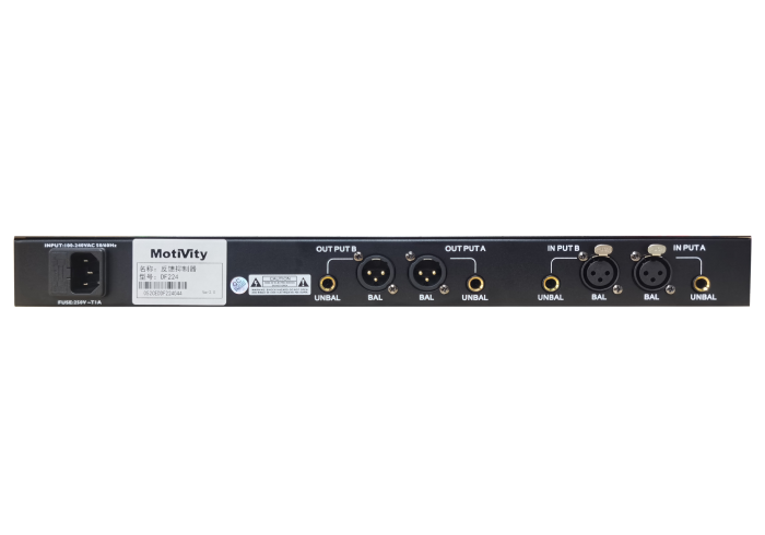 抑制器DF224 此反馈抑制器是一款数字双通道专业反馈抑制器,采用专业DSP算法实现啸叫消除,操作使用极其简单,可通过前面板显示屏进行操作调节显示,也可以通过专业PC软件进行操作;具备双通道24段高精度数字陷波器,可精准的自动检测并锁定反馈点,在反馈产生前的一瞬间,人耳没有听到前对反馈频率进行精确的足够的衰减以制止反馈产生。同时,具备场景保存及调用功能,现场使用更便捷灵活,可应用于各类会议室、会议厅、报告厅等场合;技术参数:输入阻抗:20 kΩ输出阻抗:22 kΩ频率响应:20 Hz - 20 kHz (+/- 0.5 dB @ 1 kHz)总谐波失真(THD):0.01%,1kHz连接器:2个XLR ,2个1/4" TRS最大输入电平:15dBu最大输出电平:14dBu输入灵敏度