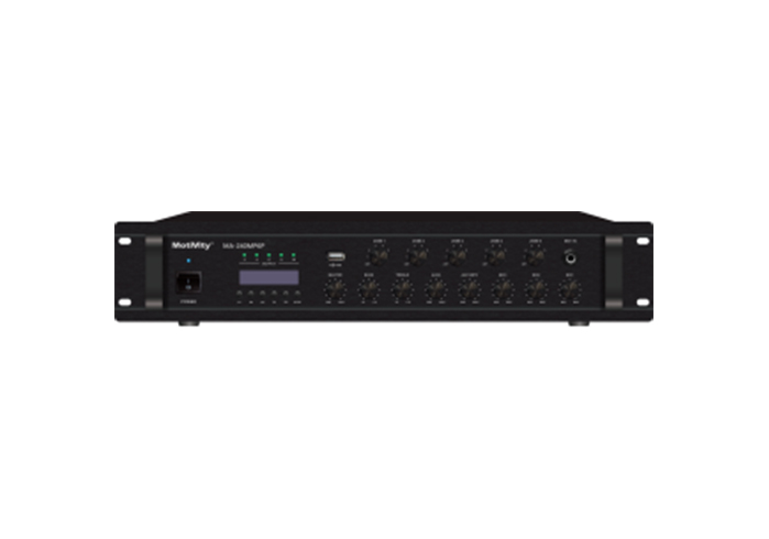 高档铝质标准2U机架,黑色拉丝面板;内部PCB全部采用双面SMT贴片电路,性能更稳定可靠;五路信号输入(三路话筒、二路线路);自带五分区输出,每分区功率独立可调节;内置蓝牙5.0无线音频接收,接收距离空旷可达10米;自带U盘插口,支持无损音乐格式,上电自动播放功能;内置FM调频收音机功能,可自动存台;五位荧光显示屏,全功能轻触式按键;设有100V、70V定压输出和4~16Ω定阻输出;总音量调节功能,各输入通道音量独立调节;高音、低音独立调节;MIC1自动默音设有调节开关,可调节范围:0到-30dB;五单元LED电平显示,动态明朗;具有完善的输出短路保护和超温保护功能;内置信号静音电路,更好的降低输出底噪;具有一路辅助音频输出接口,便于接下一台功放;输出采用工业栅栏式接线端子,连接更可靠;散热风扇温度控制启动;非