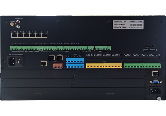音频、视频、控制模块都具有RS-232通讯输入与输出接口(方便与第三个控制设备对接),可实现级联功能;具红外、TCP/IP、直接面板操作等多种的控制方式;