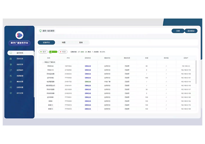 网络广播系统重要组成部分,满足多种广播预案管理方案,具备强大的信号传输模式及多种广播任务方案在线同步播出;可对整个IP-8000系列网络广播系统进行终端配置管理、播放任务配置、采集任务配置、频道任务配置、紧急任务配置、预案任务配置、分区管理、工作站配置、用户权限管理、多媒体管理以及参数设置配置等;